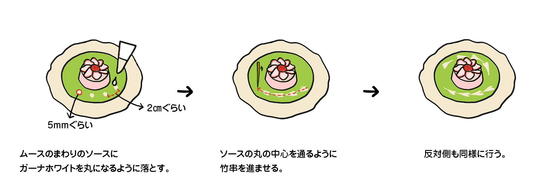 ムースのまわりに、2cmほど間隔をあけて直径5mmくらいの丸になるように落とす。