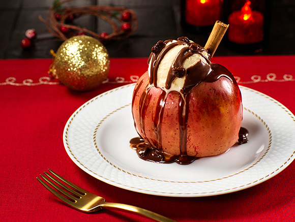 りんごを皿に盛り、シナモンスティックをさし、バニラアイスをのせ、STEP2をかける。