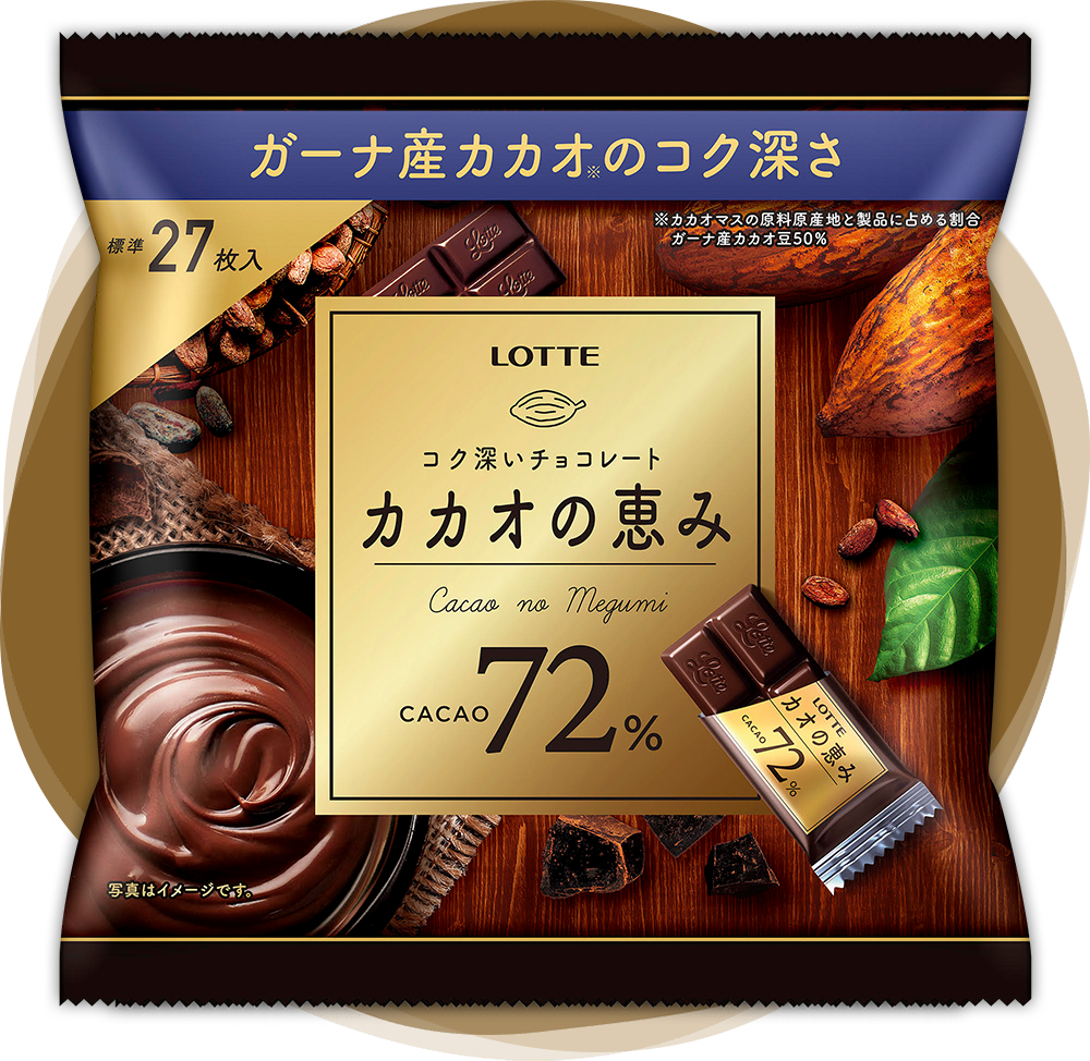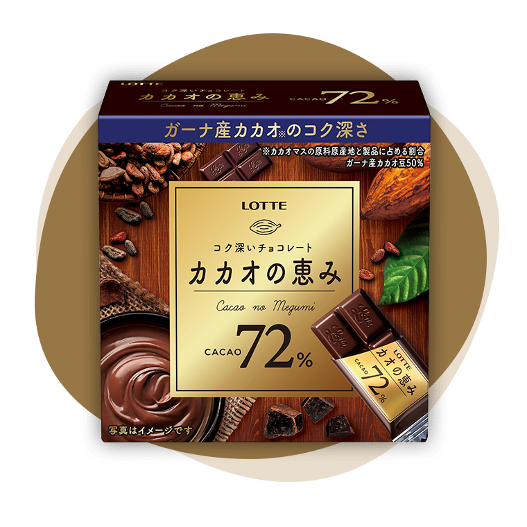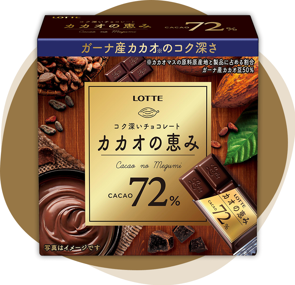 気づいてあげてほしい...カカオの恵みは、高カカオなのに、美味しいってこと...!カカオの恵みは味のバランスに優れた、ロッテ選りすぐりのカカオを使用し、コク深く、ほの甘いカカオ本来のおいしさをしっかりと引き出しています。