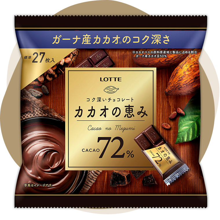 ガーナ産カカオ豆※を使用し、カカオ本来のおいしさをしっかりと引き出した、カカオ72%の高カカオチョコレート。 (※カカオマス中)