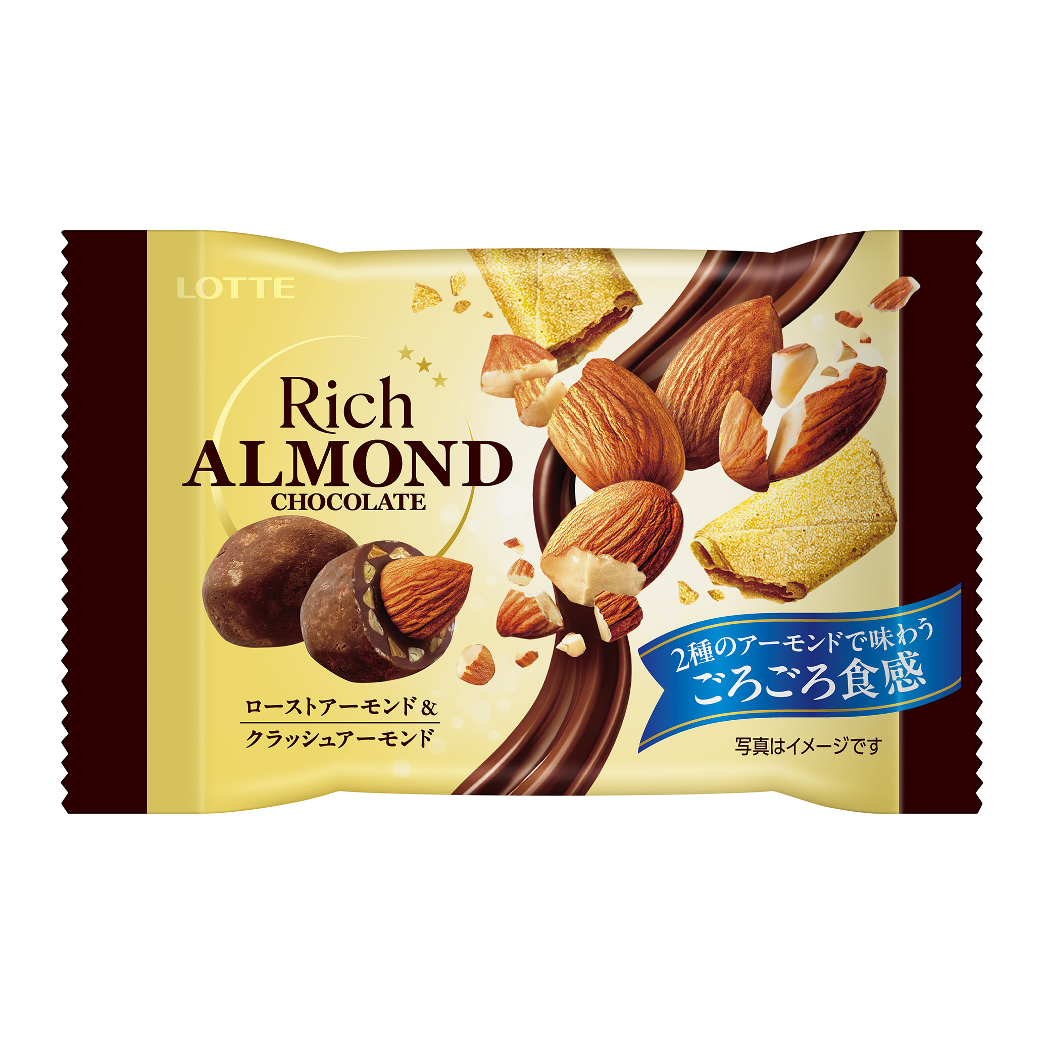 ミルクとマカダミアペーストを練り込んだ風味豊かなチョコと、カリッとローストしたアーモンドを楽しめる。