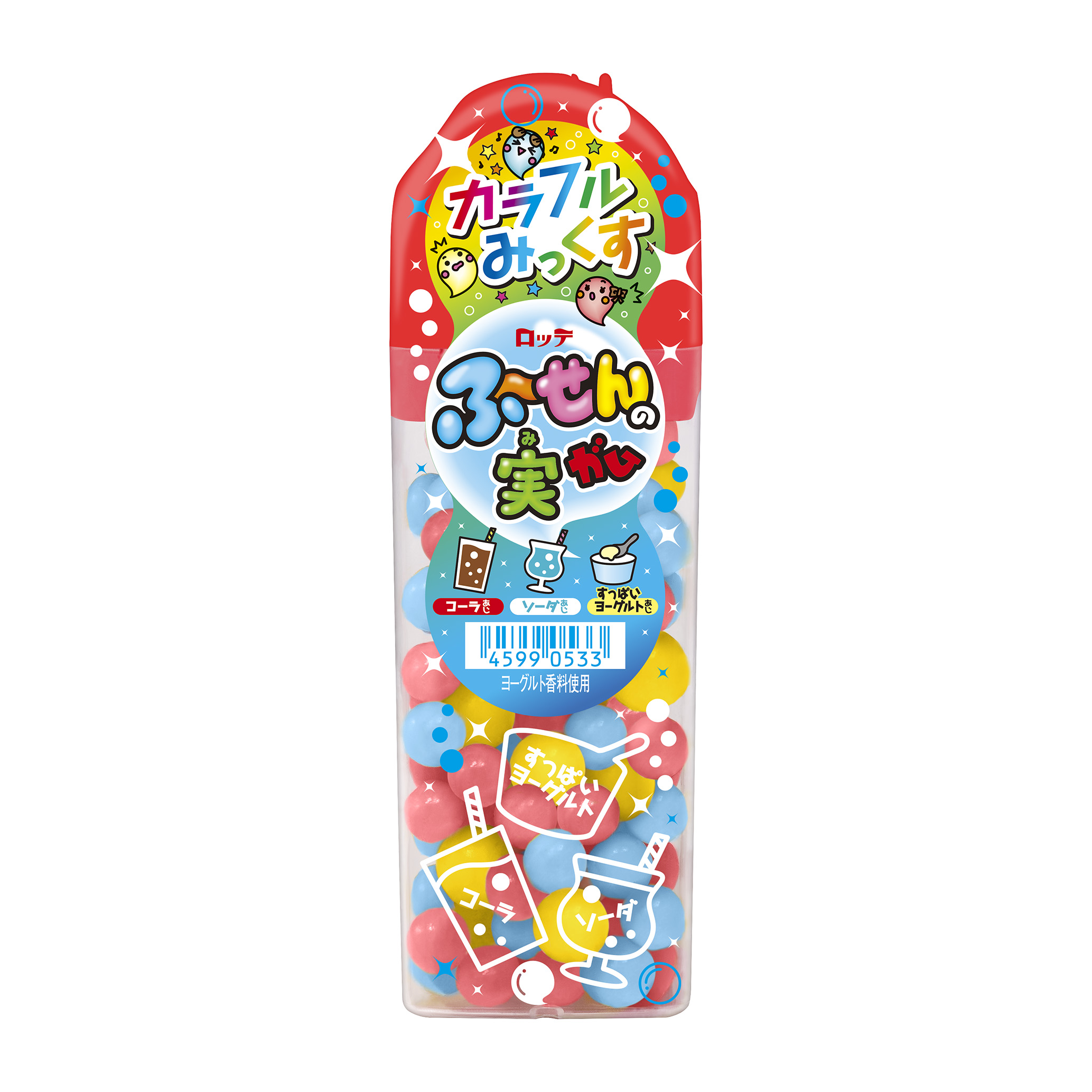 コーラ味とソーダ味、大玉のすっぱいヨーグルト味が楽しめるカラフルなふ~せんの実が登場!