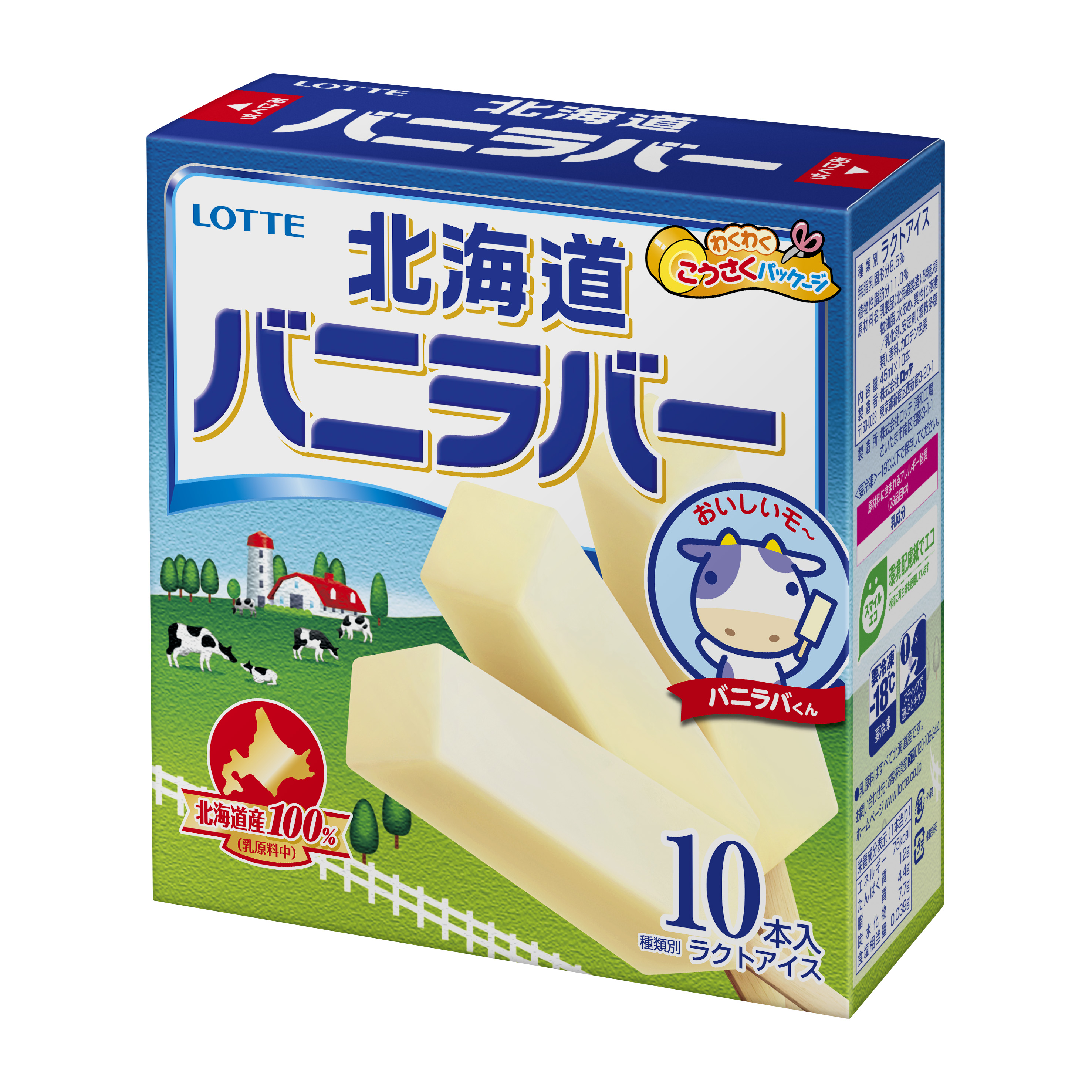 北海道産100%(乳原料中)使用でおいしく、お子様が楽しめる企画付きの楽しいロングセラーのバニラバー。